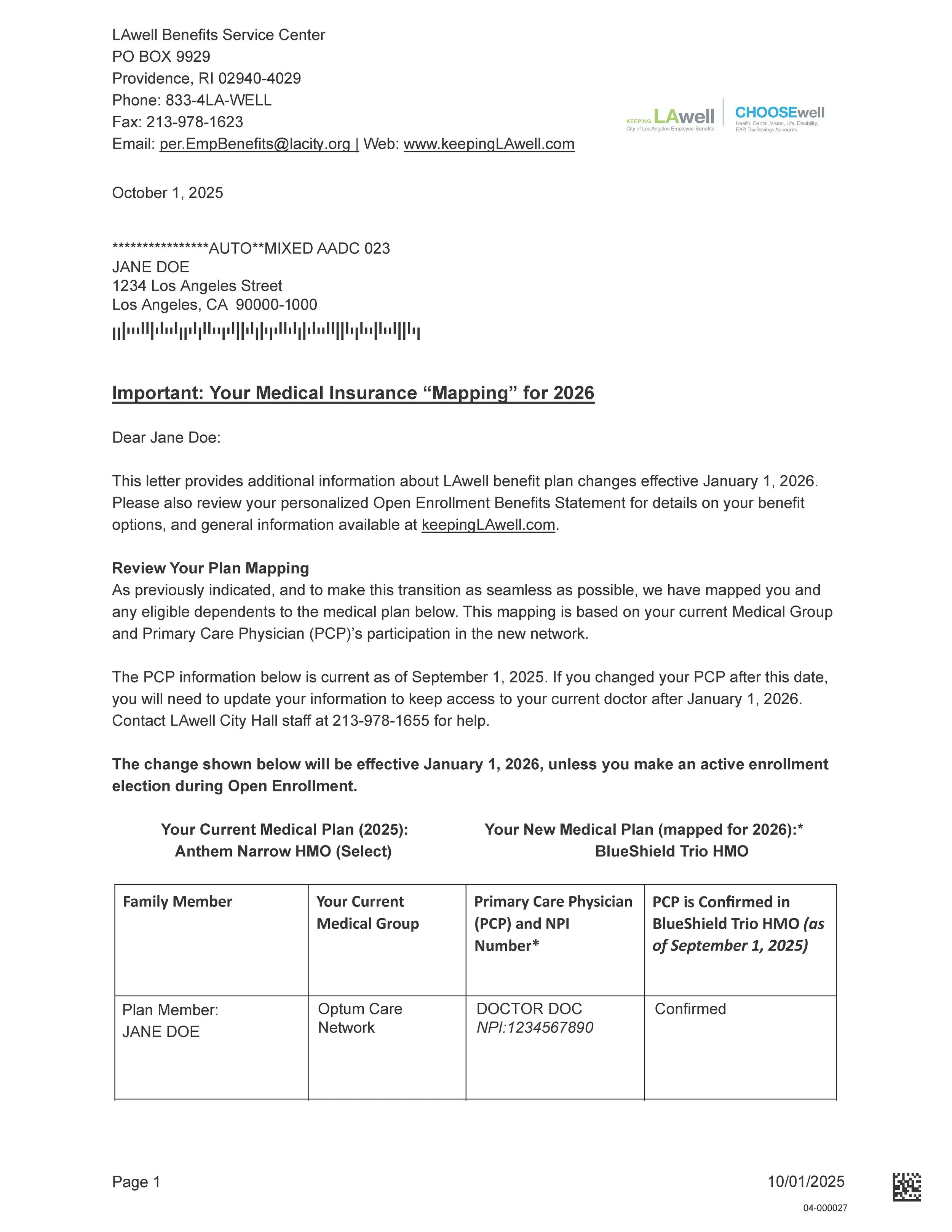 Every LAwell member will receive a medical plan mapping letter. The same letter will be mailed to the address on record and available online through the Benefits Central Portal. Anthem HMO members should pay special attention: the letter includes your PCP information and confirms how your PCP is mapped. Some letters will indicate Action Required.